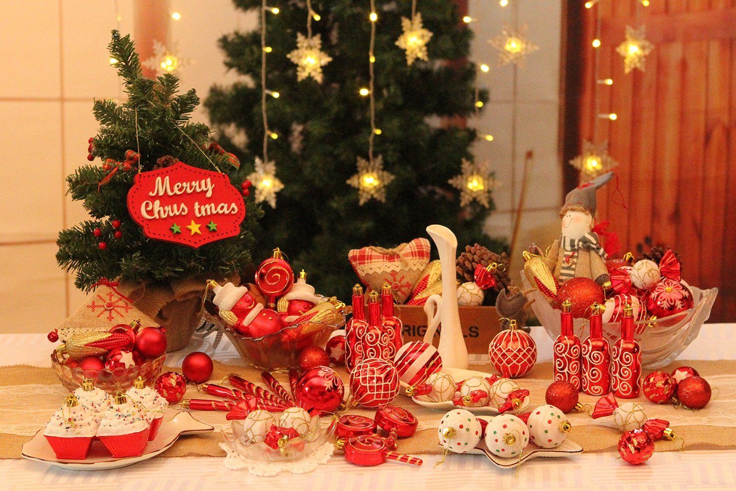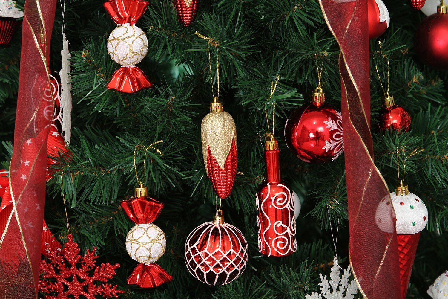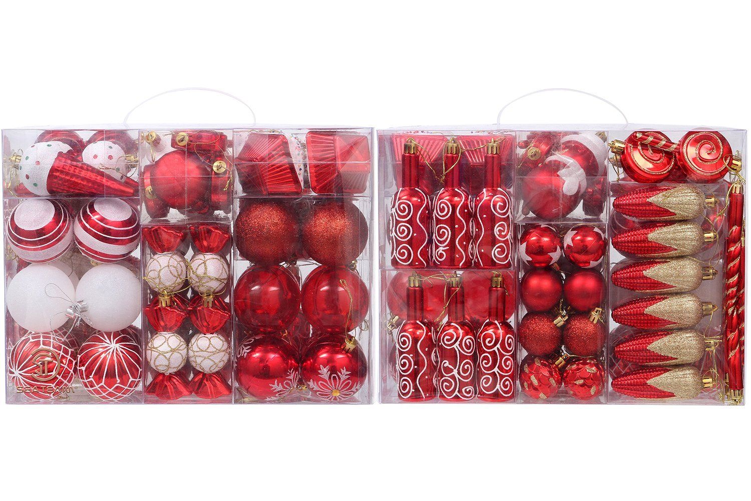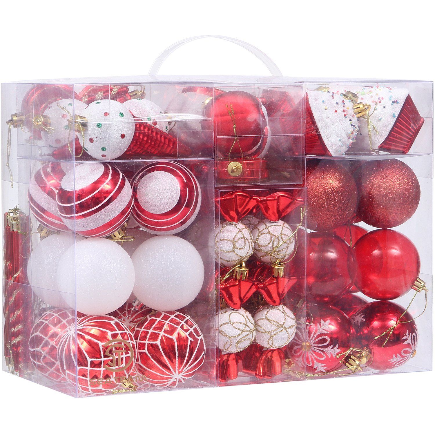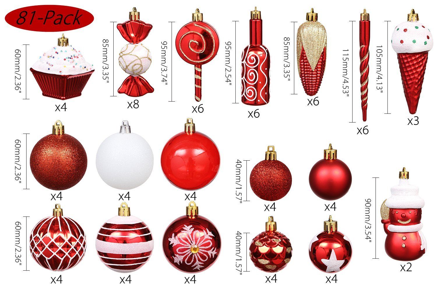 - 81-PACK CHRISTMAS ORNAMENTS – 81 pieces of Christmas ornaments in a variety of shapes and designs. Hand-held reusable plastic gift box included. Great as a perfect gift or just for self-use.