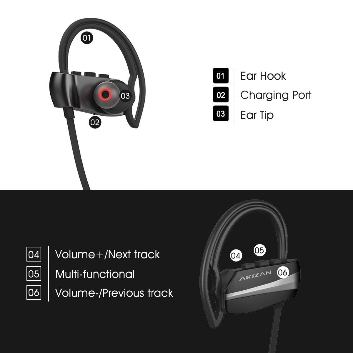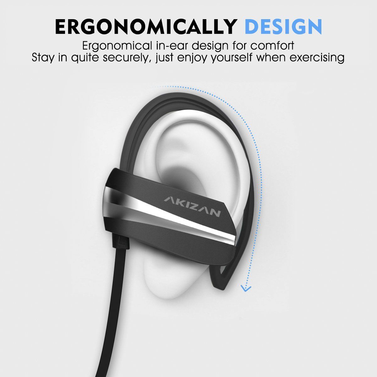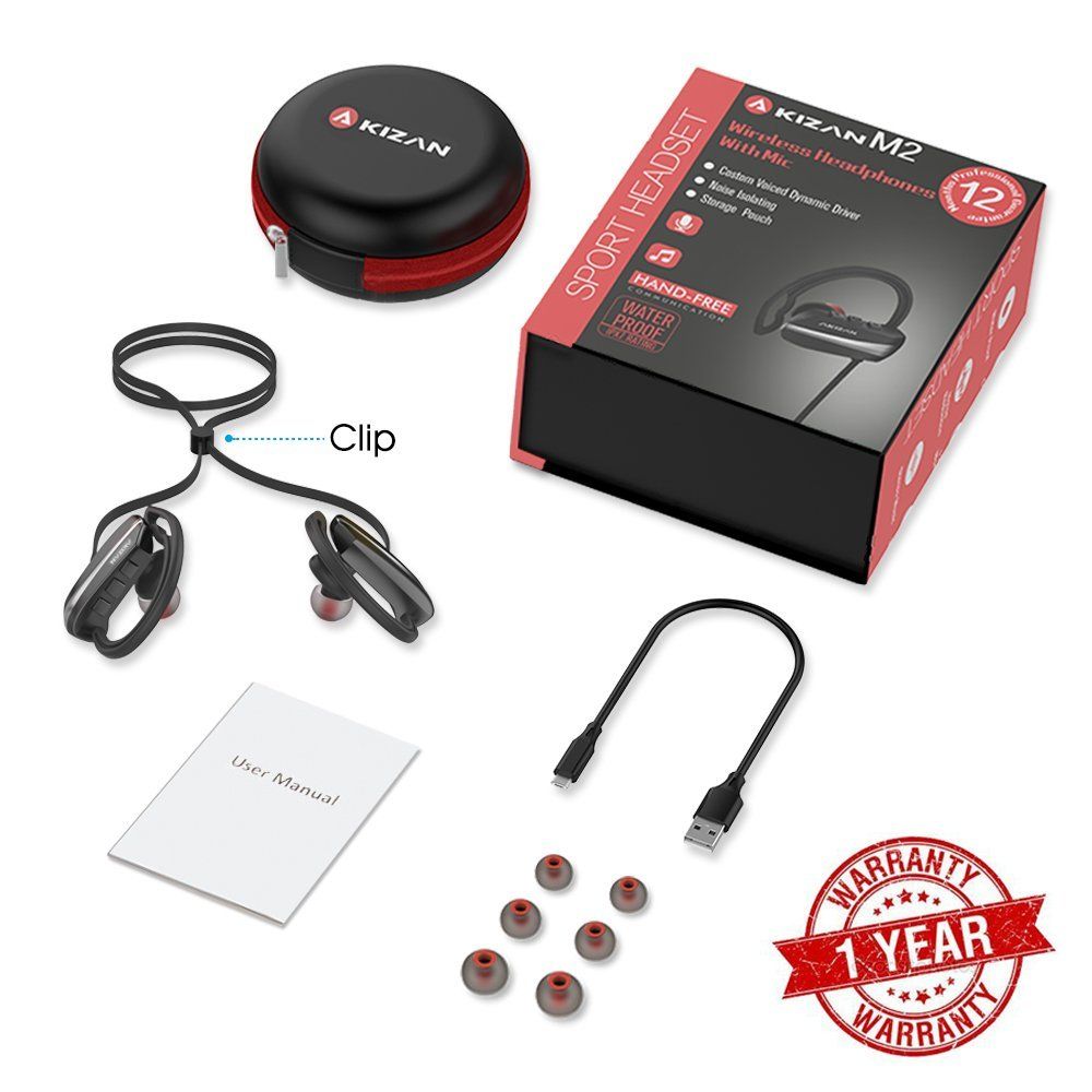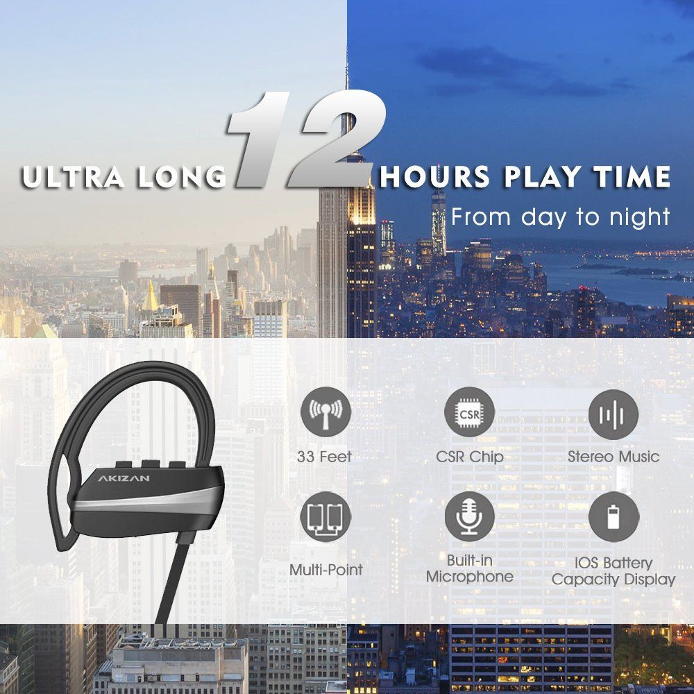 - IPX-7 WATERPROOF RATING, COMFORTABLE AND SECURE FIT – AKIZAN Bluetooth earbuds with microphone feature ergonomically designed flexible ear hooks with gel flex silicone ear buds to ensure your earphones stay comfortably firm in place to guarantee fatigue free ears and tangle free comfort.
